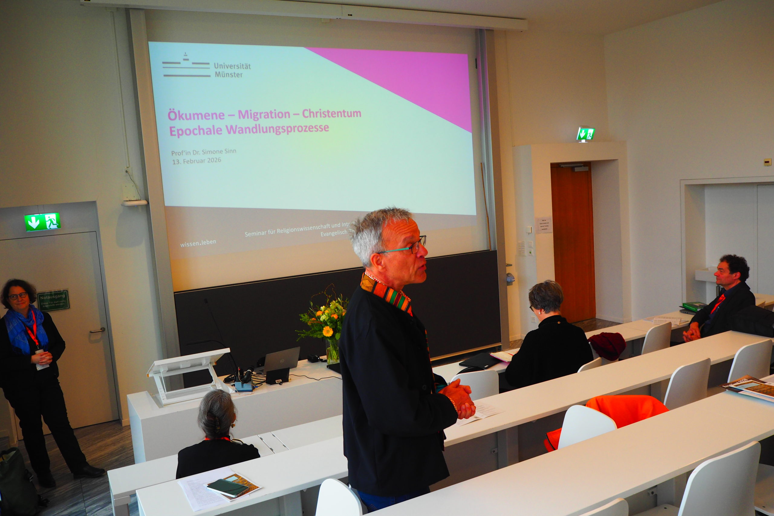 Die Veranstaltung griff aktuelle Debatten auf, die Andreas Heuser, Professor für aussereuropäisches Christentum (mit Schwerpunkt Afrika), in den letzten Jahren massgeblich mitgeprägt hat. Im Zusammenhang mit Andreas Heusers 65. Geburtstag (20.2.2026) ging es bei dem Symposium keinesfalls um eine simple Rückschau auf sein vielseitiges wissenschaftliches Wirken im Rahmen des Faches »Interkulturelle Theologie«. Das Symposium diente vielmehr als Plattform, um zentrale von Heuser angestossene Fragestellungen weiterzuführen und die »epochalen Wandlungsprozesse«, die Transformationsprozesse im gegenwärtigen Christentum überhaupt, kritisch zu diskutieren. Das Symposium nahm sich der unterschiedlichen Facetten an, welche die Südverschiebung des Weltchristentums impliziert. Roter Faden der Tagung war die Erkenntnis, dass diese im Zusammenhang weltweiter Migrationsbewegungen stehen, die den gesamten Globus betreffen und sich in alle Himmelsrichtungen erstrecken. Die Zusammensetzung der Referent:innen spiegelte sowohl die internationale Reichweite als auch die interdisziplinäre Breite von Heusers Forschung wider. Viele der eingeladenen Wissenschaflter:innen stehen seit vielen Jahren in fachlichem Austausch mit Heuser oder arbeiten in diversen Projekten mit ihm explizit zusammen. Zugleich trugen die internationale, generationelle und geschlechtliche Diversität der Vortragenden und Teilnehmenden wesentlich zur inhaltlichen Dynamik und zum Erfolg des wissenschaftlichen Austauschs bei. Im Publikum waren zudem wichtige kirchliche und wissenschaftliche Netzwerke wie Mission 21 und Glopent vertreten, die zur weiteren Vernetzung und Diskussion beitrugen.